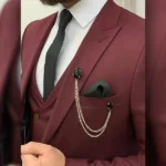 Fancy clothing are the trendy in fashion. These clothes are available in each sort of color, it can be a pastel one or the vibrant ones upon your chosen preference. But those that make the declaration and might turn out to be the point of interest of every eye casually or on a unique event, the unique dense shades are the best. These forms of clothing show off the ambitious and ravishing persona inner of someone and beautify it even extra. Keeping this strong point as the point of interest, this Men’s three Piece Burgundy Wedding Suit is designed with care. The entire attire is made with a deep knowledge of the latest style developments so that you can appearance stylishly charismatic anyplace you pass.