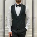Made with excellent suiting fabric, that is tough from outside and soft from inside. The whole piece includes a coat, pants, and a vest if you prefer to buy. It’s designed in a rich black color with simple yet sturdy stitching. Further features of the coat are peak lapel collar welt pocket on the chest and a swift button closure. Available in all sizes, whether it’s for kids or a grown man. It can give you a vintage while trendy look at the same time.
